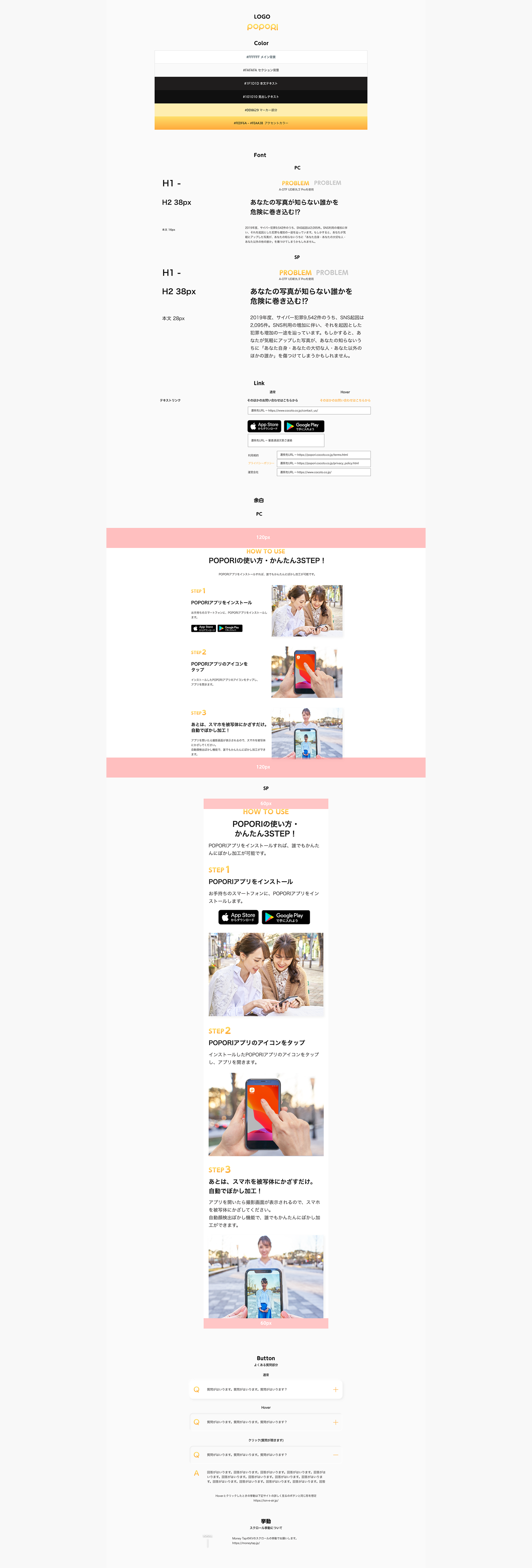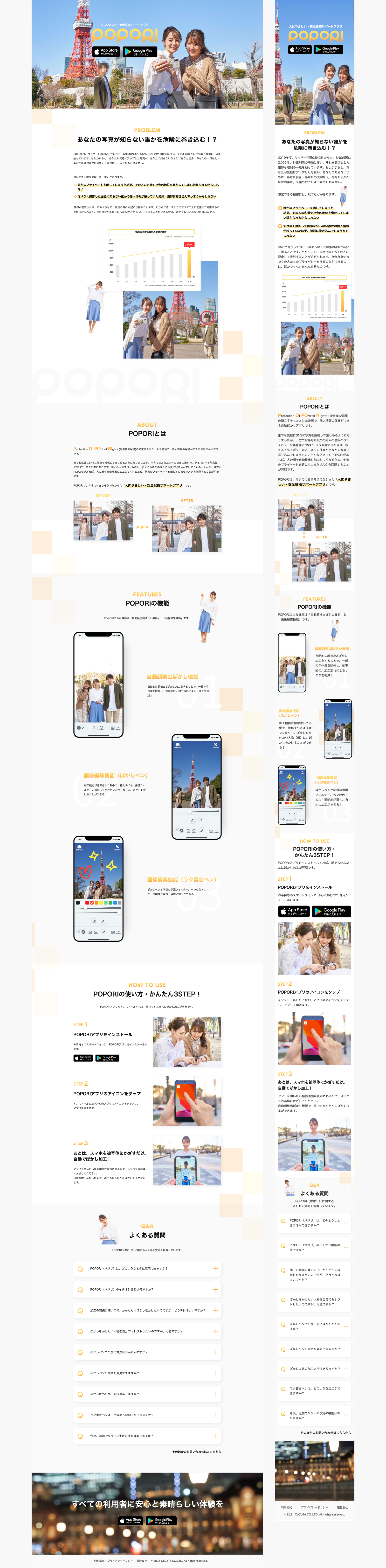 SNSへの投稿前に顔や個人情報を隠すためのモザイクアプリ「popori」のランディングページのデザインを担当しました。手軽にプライバシーを守れるアプリとして、20〜30代の女性に届くLPを目指しました。
