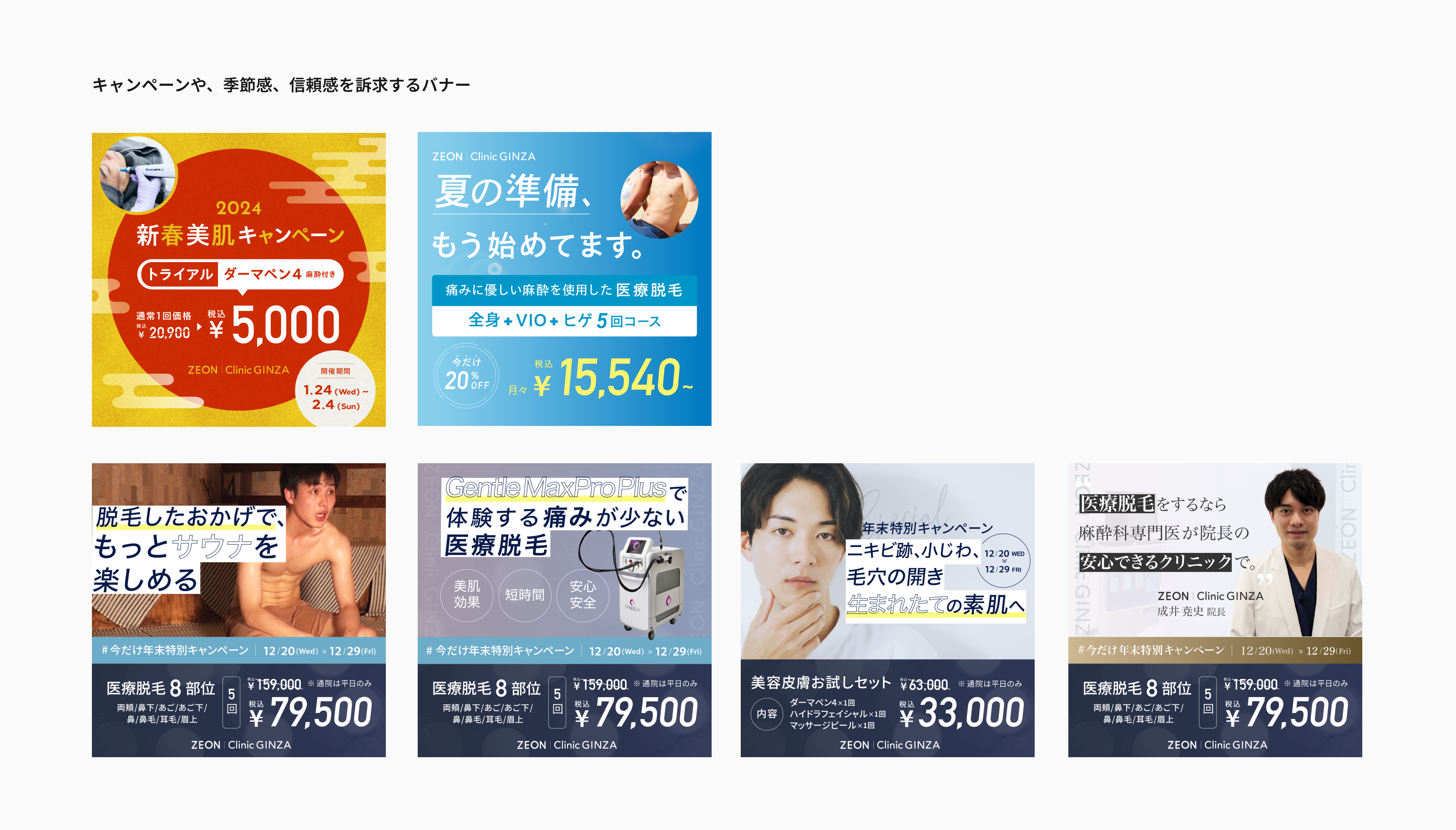 一方で、SNS上では短時間で興味を持ってもらう必要があるため、キャンペーンや期間限定施策においては、季節感のある表現や、サウナなどトレンドを取り入れたコピー・ビジュアルを用いるなど、内容に応じて訴求を強めた表現へと切り替えました。また、信頼性を補強するために院長の顔出しを取り入れるなど、訴求内容に応じて見せ方を調整しています。