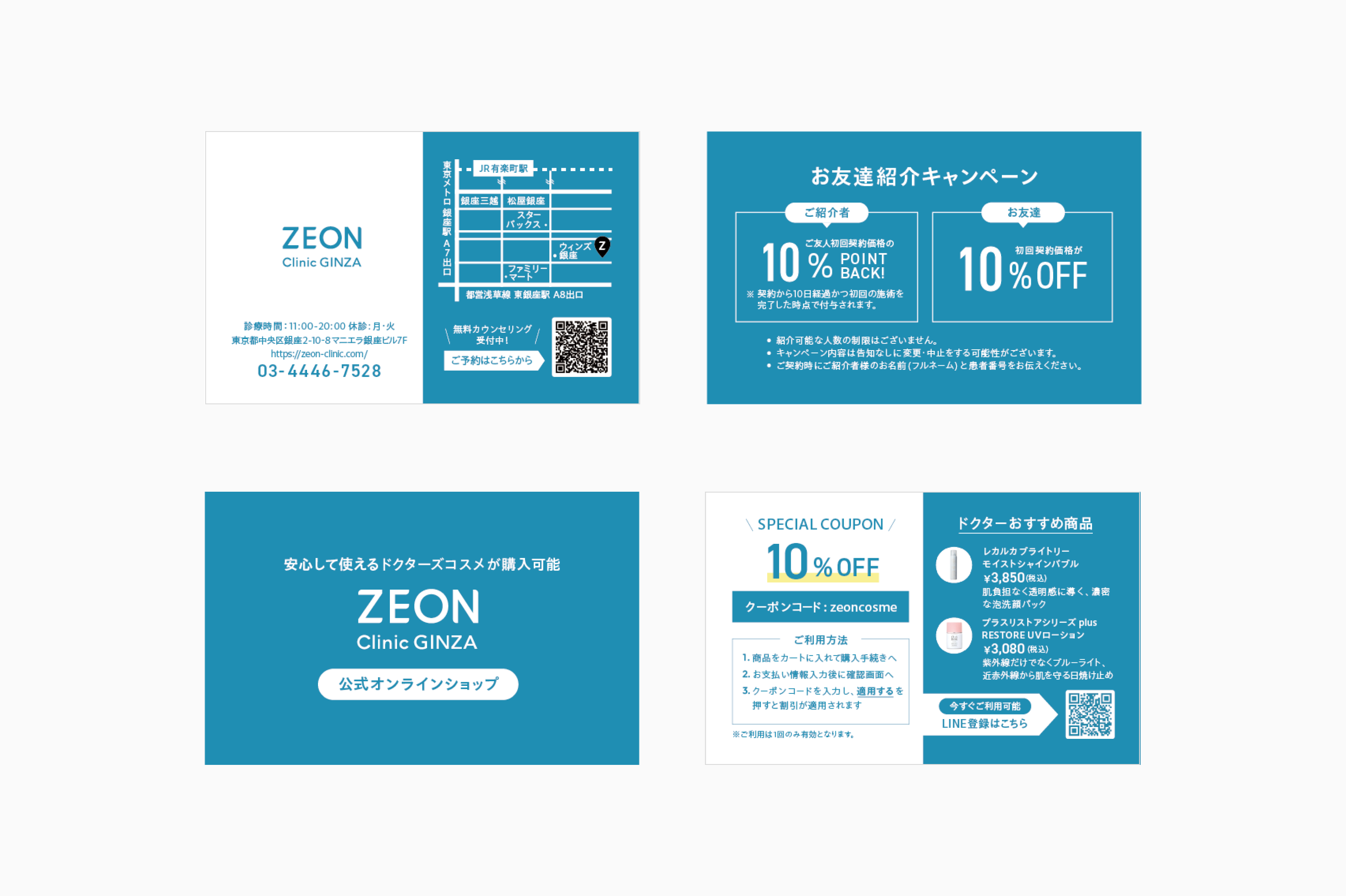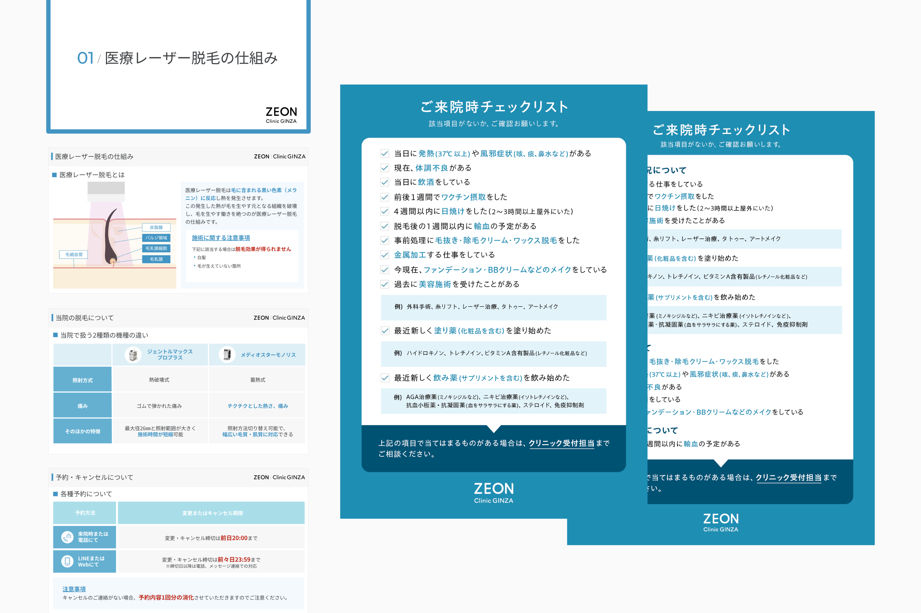 ゼオンクリニックのメインカラーであるターコイズブルーを基調としながら、過度に装飾的にならないシンプルな表現をベースに、安心感と新しさのバランスを意識しました。