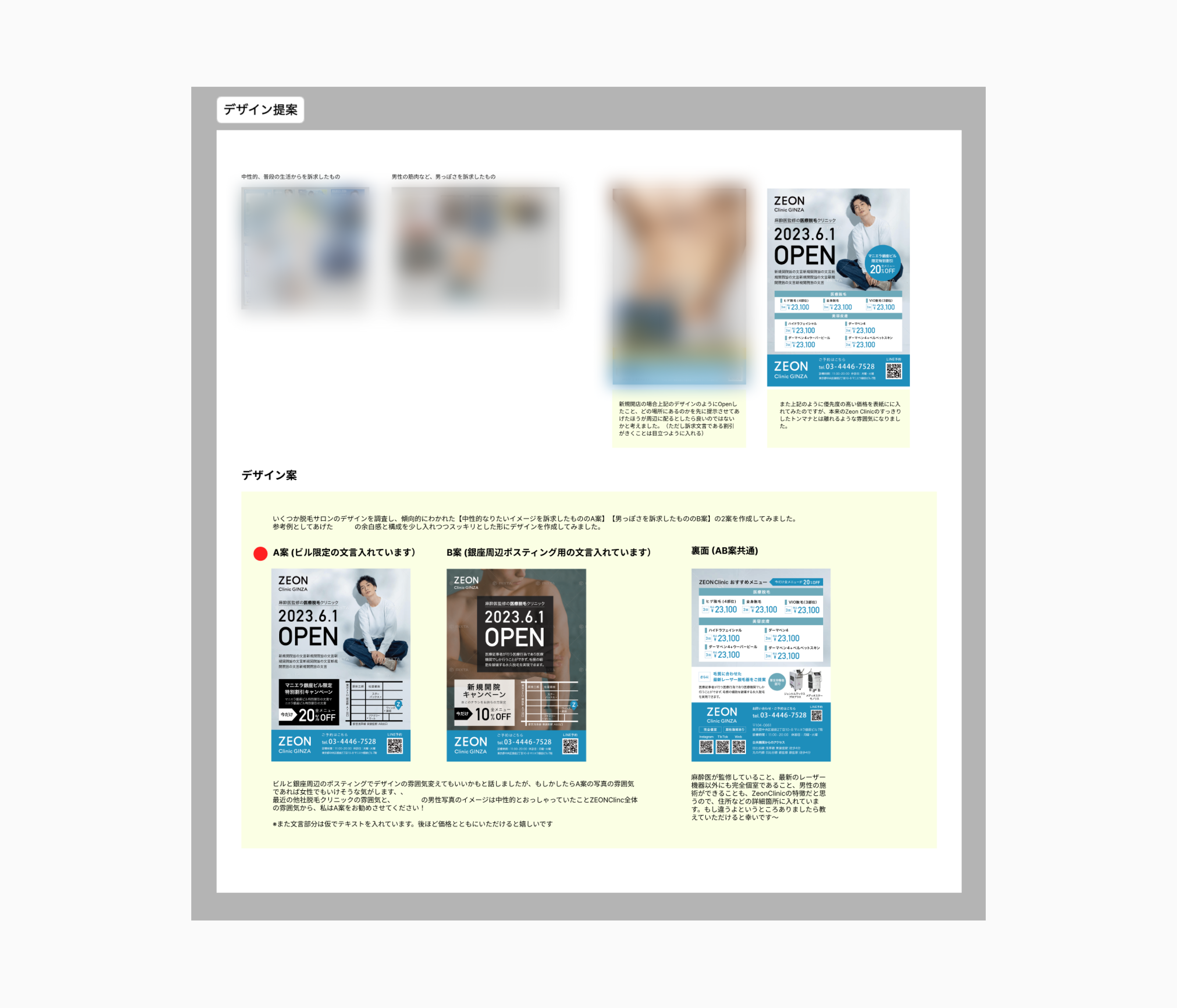 開院にあたり銀座エリアでのポスティングおよびクリニック内での配布を目的としたポストカードも制作しました。配布場所によって想定されるユーザー層が異なるため、男性を主なターゲットとしつつも、パートナーなど女性の目にも触れる可能性を考慮し、訴求の方向性を検討、男性らしさを強調した案と、フェミニンな要素を取り入れた案の2軸でデザインを作成し、比較検討を行いました。